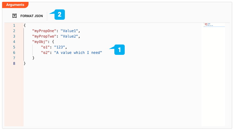 In case you are entering arguments (1), the editor will check for valid JSON and outline this in case it is invalid.
