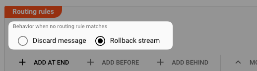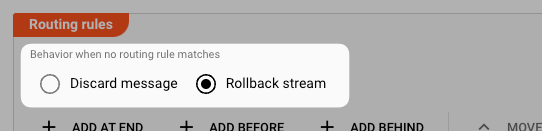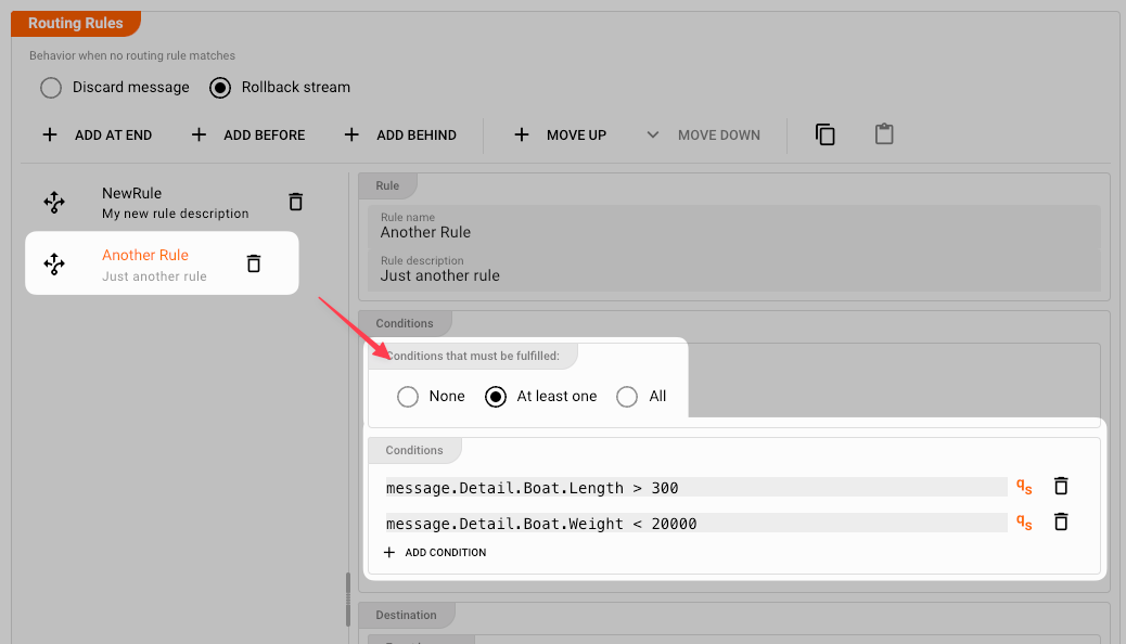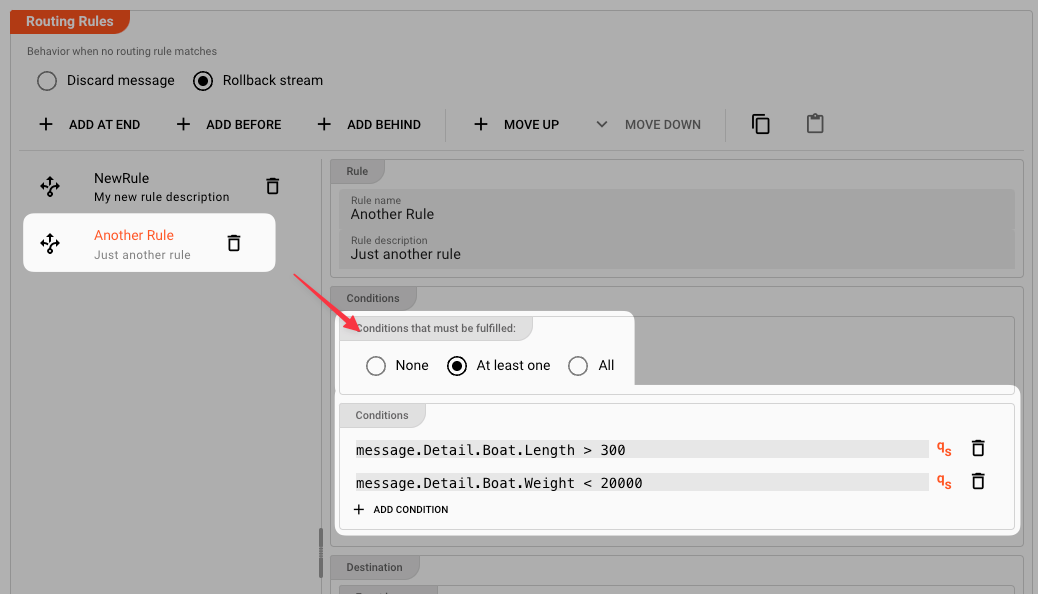 Next, you can define individual routing rules for messages which shall be output to SQS. Rules are evaluated in order. The first one takes precedence over the second and so forth. Use the respective buttons to add or move a new rule in the designated space: