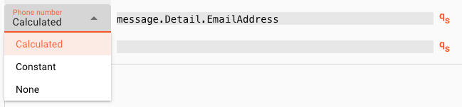 Calculated: Enter a Quickscript term which returns phone number or email address. This is especially useful if the message contains a specific field which contains the necessary information.