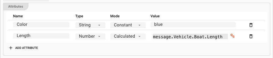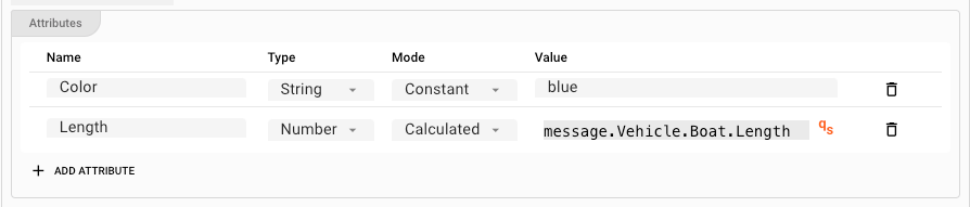 Name: Enter a unique attribute name. Avoid spaces.Type: Pick a type fromString,Number, orBinary. The binary type is useful in the context of calculated content.Mode: PickConstantfor a fixed value, orCalculatedfor a value derived from a QuickScript term. This can include information retrieved from the current message.Value: The value depending on what you picked inMode.