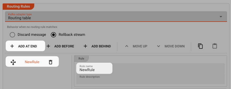 Based on your settings above, this is where you can define individual routing rules for messages which shall be output to Kafka. Rules are evaluated in order. The first one takes precedence over the second and so forth. Use the respective buttons to add or move a new rule in the designated space: