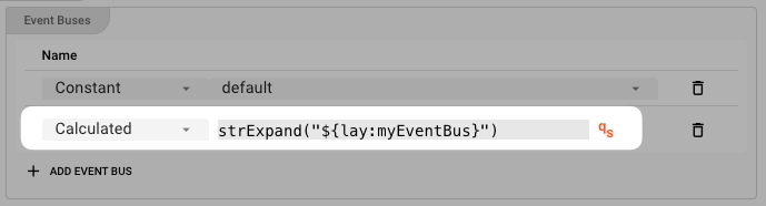Calculated: Enter a Quickscript term which evaluates to an Event Bus name. You can also use ${...} macros to expand variables defined in environment variables. Make sure the result is enclosed in quotes as a result to form a valid result string.