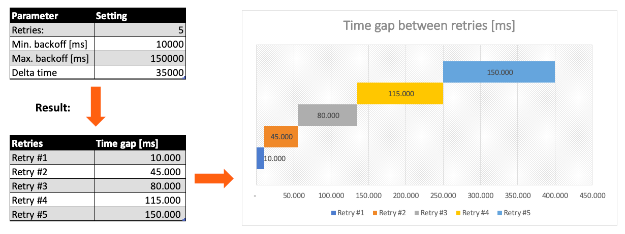Based on these parameters, the system will try to balance the defined number of retries within the time boundaries of min. backoff and max. backoff.