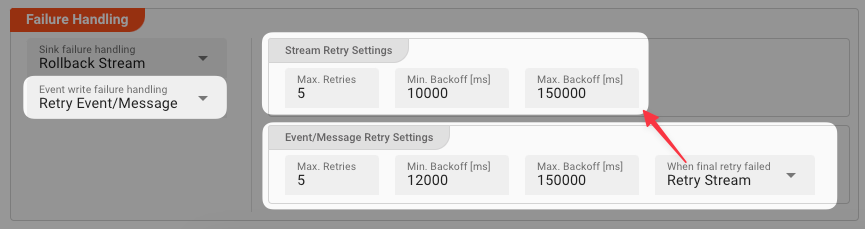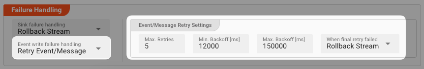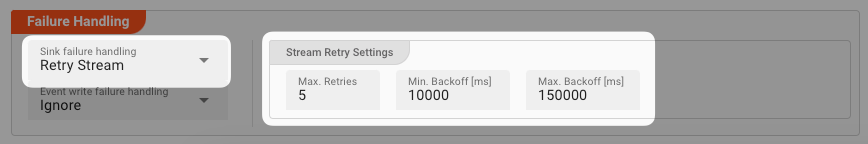 Max. Retries: The number of retries which should be performed. For example "5".Min. Backoff [ms]: Wait at least x milliseconds between each retry. For example "12000" (12 seconds).Max. Backoff [ms]: Wait at max x milliseconds between each retry. For example "150000" (150 seconds).