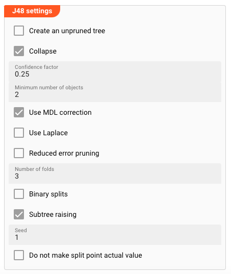 If you selected the Weka J48 algorithm, you can define the following parameters: