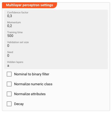 The Decay parameter determines whether or not to use this learning rate decay technique. When this parameter is set to "true", the MLP algorithm will gradually decrease the learning rate as training progresses. When this parameter is set to "false", the learning rate will remain constant throughout training.