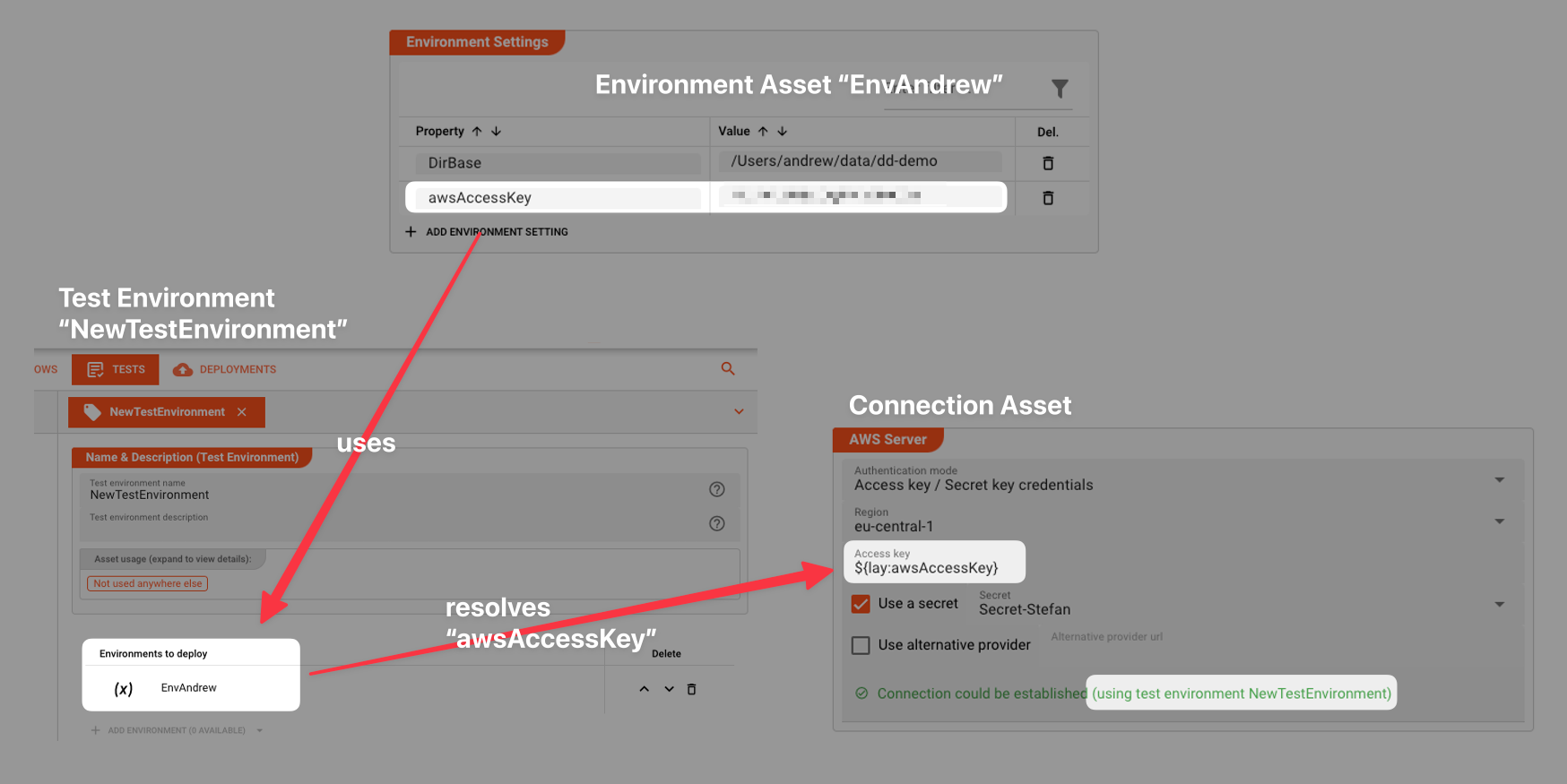 • Because the Project in the UI uses the Test Environment, and the Test Environment uses the Environment Asset "EnvAndrew", the AWS Connection Asset knows how to resolve the macro at configuration time, and thus can test the connection.