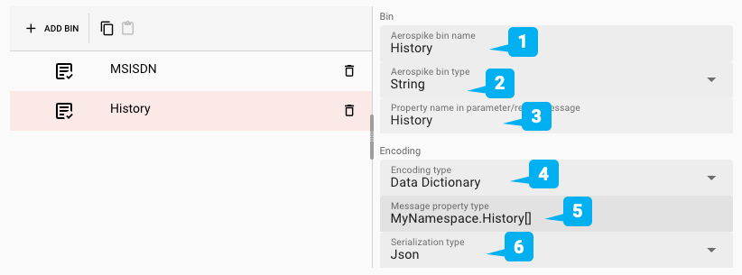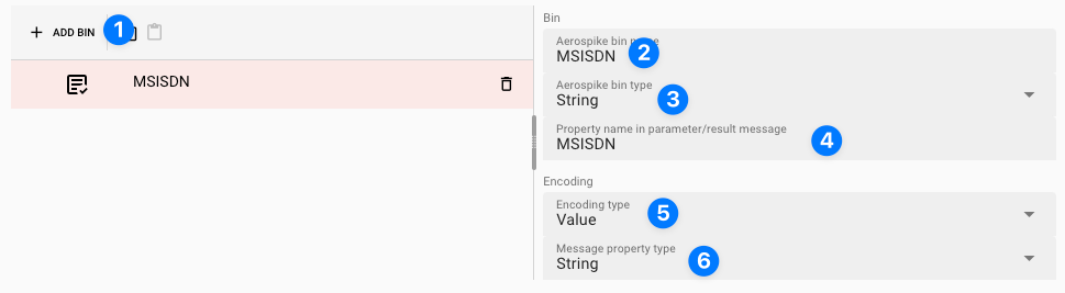 Aerospike bin name(2): Name of the Bin. Must be the name of the Bin in Aerospike.Aerospike bin type(3): This is the type of how the data is stored in Aerospike. Note that Aerospike automatically deduces the data from its content.Property name in parameter/result message(4): This is the property name of how the value of the Bin will be read and set within layline.io’ internal message structure. This become clear when we describe how the data is referenced when working with it.