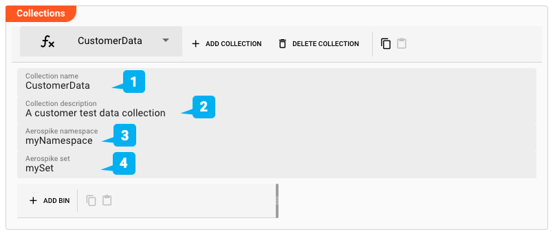 Collections on the other hand allow you to define a schema and will automatically create respective read, write, AND delete from/to methods. You can for example define a Collection “CustomerData” which configures access to a Namespace, Set, and Bins, and the Collection will automatically provide read, write, and delete methods.