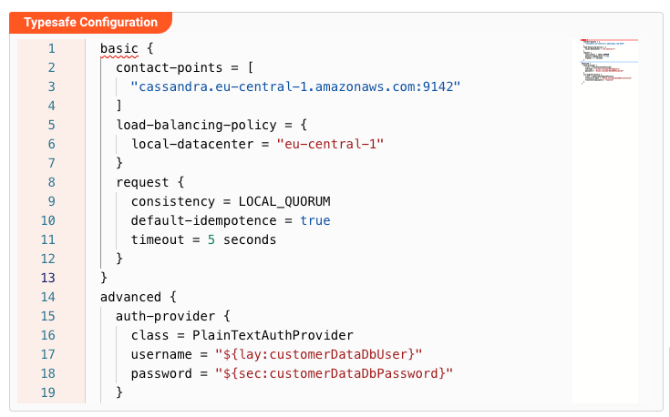 Access to Cassandra and Keyspaces data sources relies on the Datastax-Driver. This driver allows for a wide number of configuration options. You can configure these options here. As to which configuration options are available, please refer to the Datastax-Driver documentation.