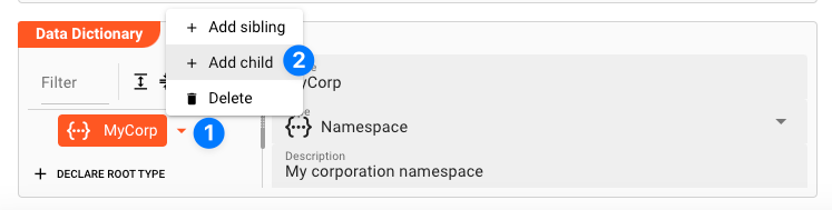 Add childto add a child element to the namespace - Fill in the details: