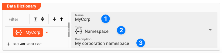 Type(2): Pick the type of the element. In our example we first define a namespace. When we define additional elements under that namespace we will pick any of the other data types to actually hold the data. -