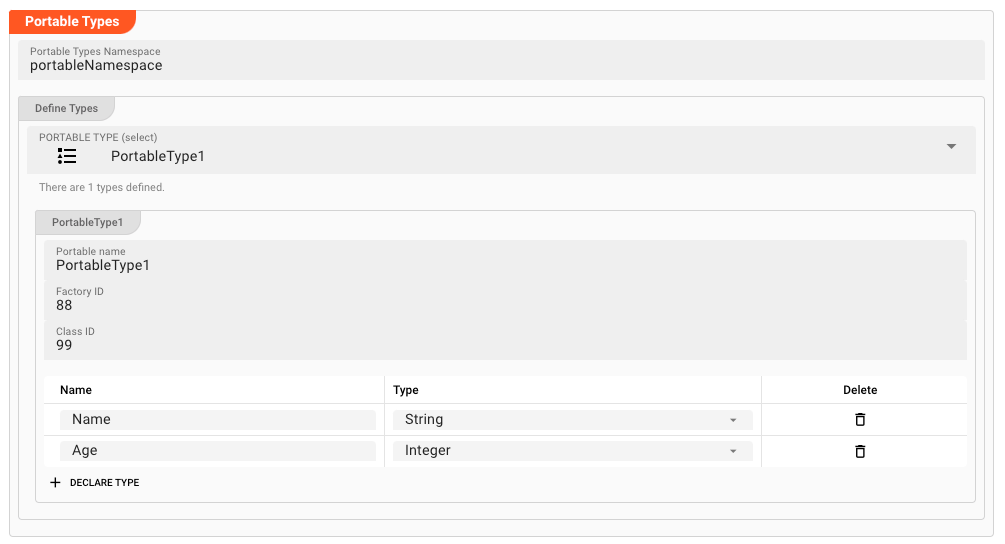Name: Internal name of the Portable Type.Factory ID: The Factory ID which you have defined for this Portable Type in Hazelcast.Class ID: The Class ID which you have defined for this Portable Type in Hazelcast.