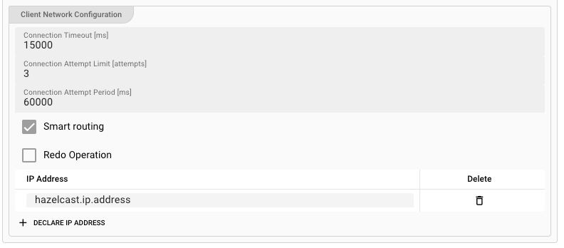 Smart routing: Check this box to enable smart routing. Smart routing is a feature that allows the client to connect to a cluster member that is close to it. This is useful when the client and the cluster are in different data centers. -