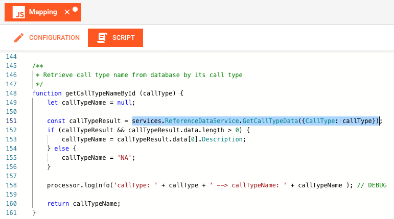 Now that we have set up the JDBC Service we can learn how it can be used. In the example, a JavaScript Processor in the Workflow will use the JDBC Service and invoke the function GetCallTypeData to get the related information from the database.