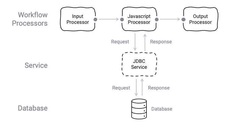 What's happening here, is that a Processor (JavaScript Processor in image) makes use of a Service (JDBC Service in image) in a request/response pattern.