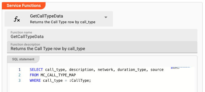 Next we create a function GetCallTypeData which retrieves a number of fields for a given CallType. The CallType by which we query the data from the database is contained in the telecoms usage data which is processed by the Workflow.