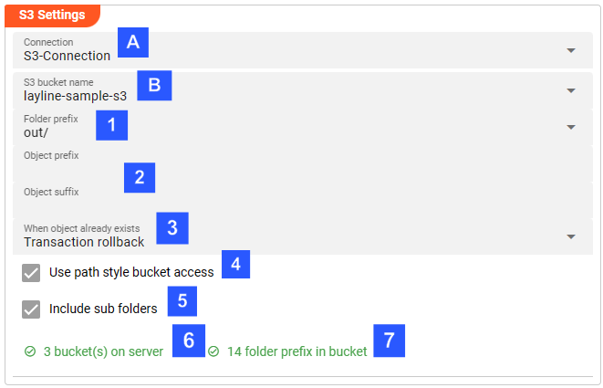 • S3 bucket name (B): Once you picked a S3 Connection above the system will try to test the connection and list bucket names it can find. These will be available for selection here. You can check how many buckets could be found at (6)