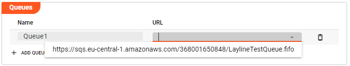 Once you picked a SQS Connection above the system will try to test the connection and show available queues within the drop-down list under URL. You can define a Name for each URL in here to reference those when guiding resp. routing messages towards SQS sink queues within the Frame Output Processor configurations. More details can be found here.