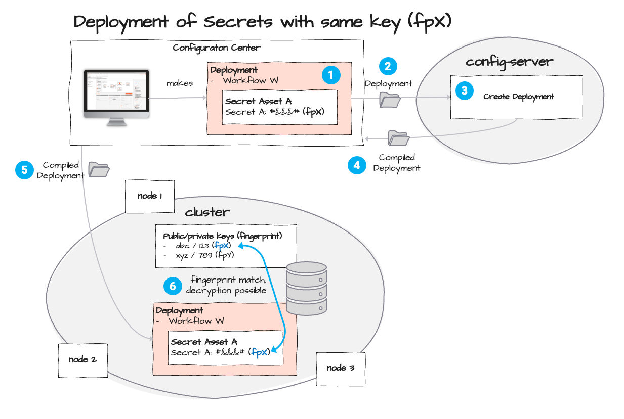 The Deployment (1) is sent (2) and compiled on the Configuration Server (3). The Configuration Server sends it back to the Configuration Center (4) which then forwards it to the Cluster (5). Because the Cluster is aware of the key-pair with fingerprint "fpX" the Secrets can be safely decrypted.