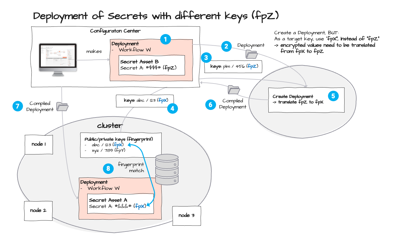 In the Deployment flow above we deploy Workflow "W" with "Secrets Asset B" (1). Please note that it is encrypted with key-pair fingerprint "fpZ". As part of the Deployment we have defined that Secrets shall be re-encrypted with key-pair fingerprint "fpX" (2). For this purpose, and in our example, the public key part of "fpX" is retrieved from the Cluster (4) and sent to the Configuration Server together with the local key-pair "fpZ". The Configuration again compiles the Deployment and - this time - it also re-encrypts all Secrets using fingerprint "fpX" **(5) **. The compiled Deployment is then sent back to the Configuration Center UI (6) which sends it to the Cluster (7). The Cluster is now again able to match the Secrets encrypted with "fpX" to the local private key "fpX" for decryption at runtime (8).