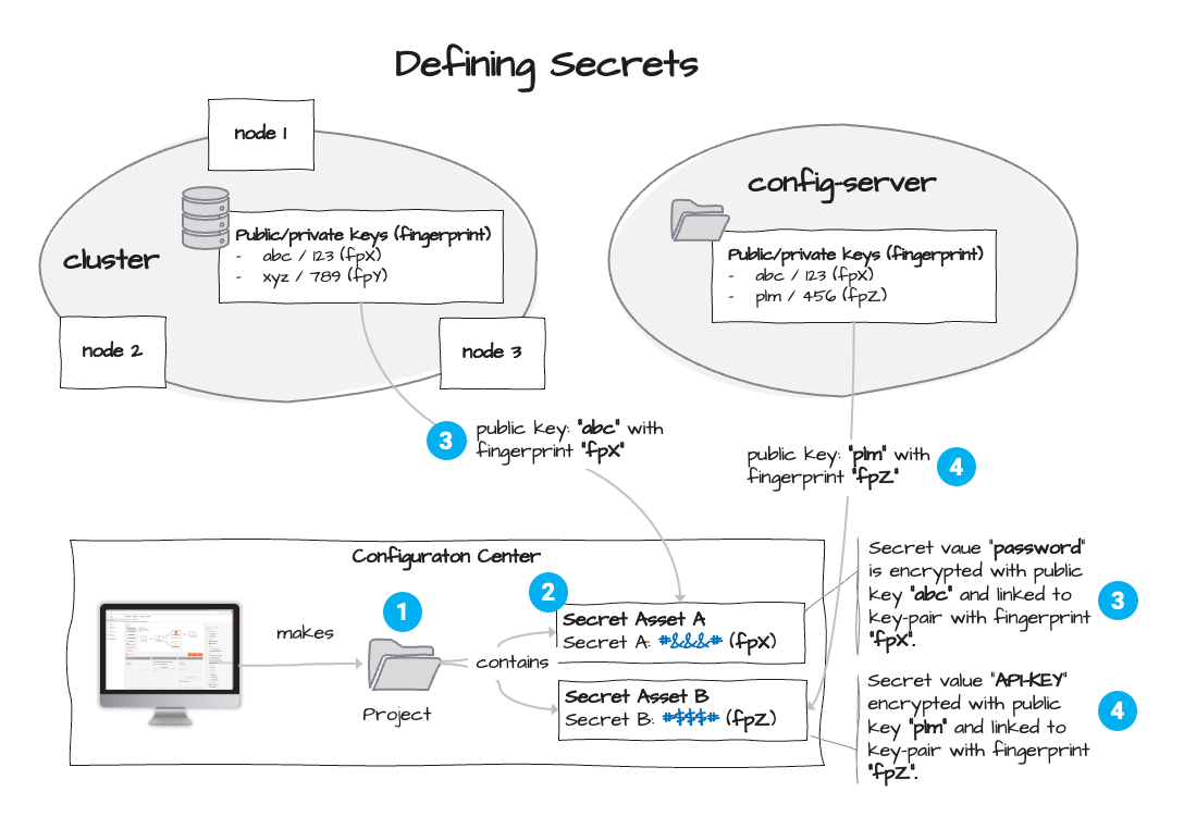 In the example we have a Secret Asset A. This Asset is references key-pair fpX from the Cluster (3). Therefore all secrets in Asset A are encrypted using this particular key-pair. Secret Asset B on the contrary references key-pair fpZ from the Configuration Server (5). All Secrets configured within this Asset are then encrypted using this key-pair fpZ.