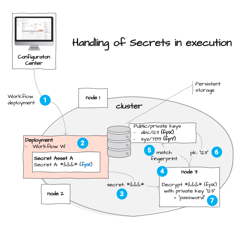 Encrypted Secrets are being sent to the Cluster as part of a Deployment (see above), which in turn contains one or more Workflows (1). Workflows may reference Secrets (2). The matching key to decrypt these Secrets is identified by the given fingerprint (fpX). In the course of Workflow execution, referenced Secrets require decryption (3). Based on the fingerprint (4) "(fpX)" the system looks up the corresponding private key "123" (5) which is used to decrypt the value "#&&&#" (6), resulting in the decrypted value "password" (7).
