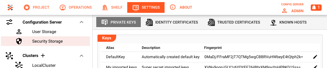 The management of the key-pairs is exactly the same as with the key-pairs in the Configuration Server, except that it all happens on a Cluster. To learn how to create or import a key please refer to here.
