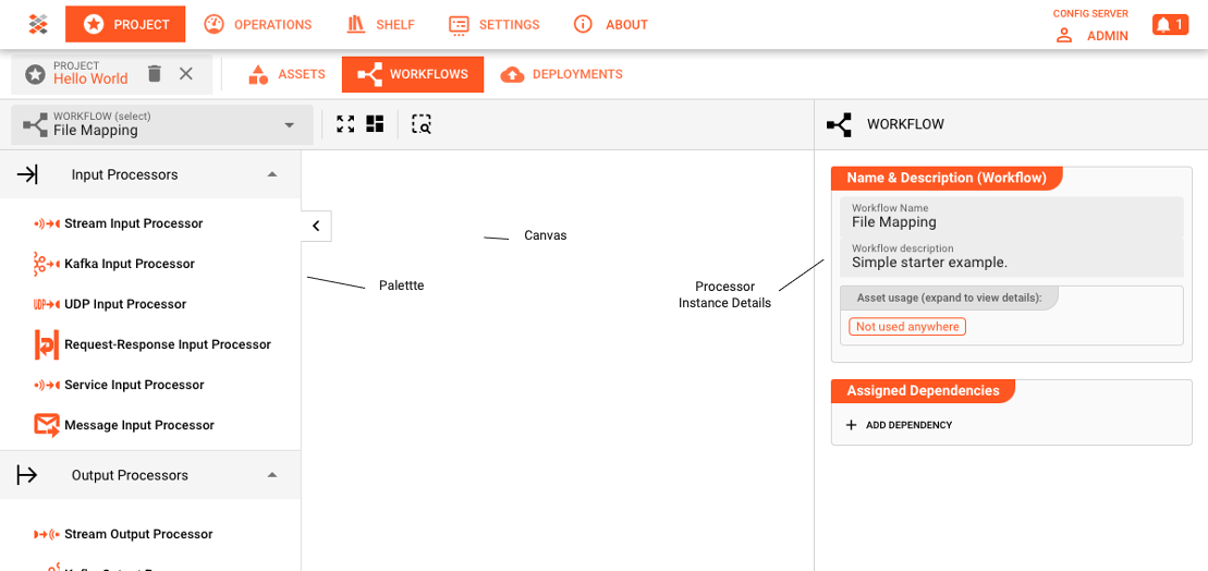A Project is the organizational structure in which you perform configurations. It contains one or more Workflows which are comprised of Processors. Processors in turn are manifestations of Assets._