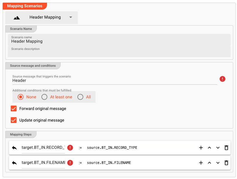 We are mapping the incoming data to the format of the outgoing data. We need to create mappings for each "record format" of Header, Detail, and Trailer which we want to map to the outside. We do so in the "Mapping Scenarios" section.