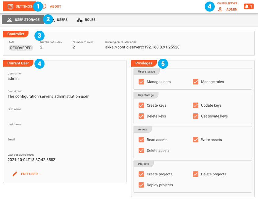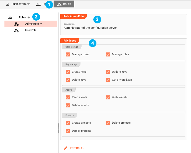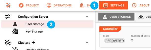To manage Users and Roles on the Configuration Server navigate to Settings - User Storage (1) and (2).
