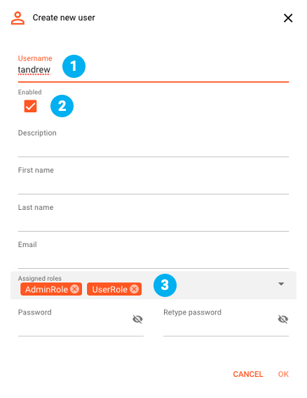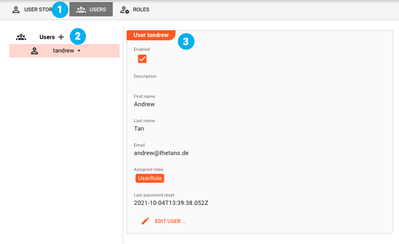 You can define whether a User should be enabled or not (2) and which Roles the User should be assigned to (3). Click OK. You can then see the details of the newly created user on the right panel.