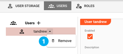 To remove a User select the User in the tree. Then click on the down arrow and select Remove.