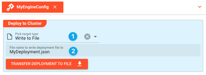 To deploy to a file select Write to File (1) from the "Deploy to Cluster" box. Enter the name of the file where to store the Deployment file (2).