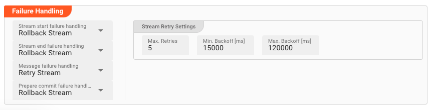 Max. Retries: The number of retries which should be performed. For example "5".Min. Backoff [ms]: Wait at least x milliseconds between each retry. For example "12000" (12 seconds).Max. Backoff [ms]: Wait at max x milliseconds between each retry. For example "150000" (150 seconds).